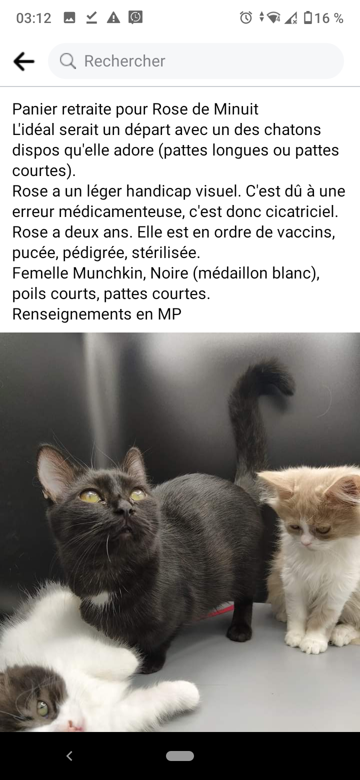 - Rose de minuit, femelle noire, poils courts, pattes courtes.2 ans. Léger handicap visuel non évolutif. Placement en appartement uniquement ou maison avec jardinet sécurisé par des murs hauts ou volière. Je serai exigente sur ce placement.